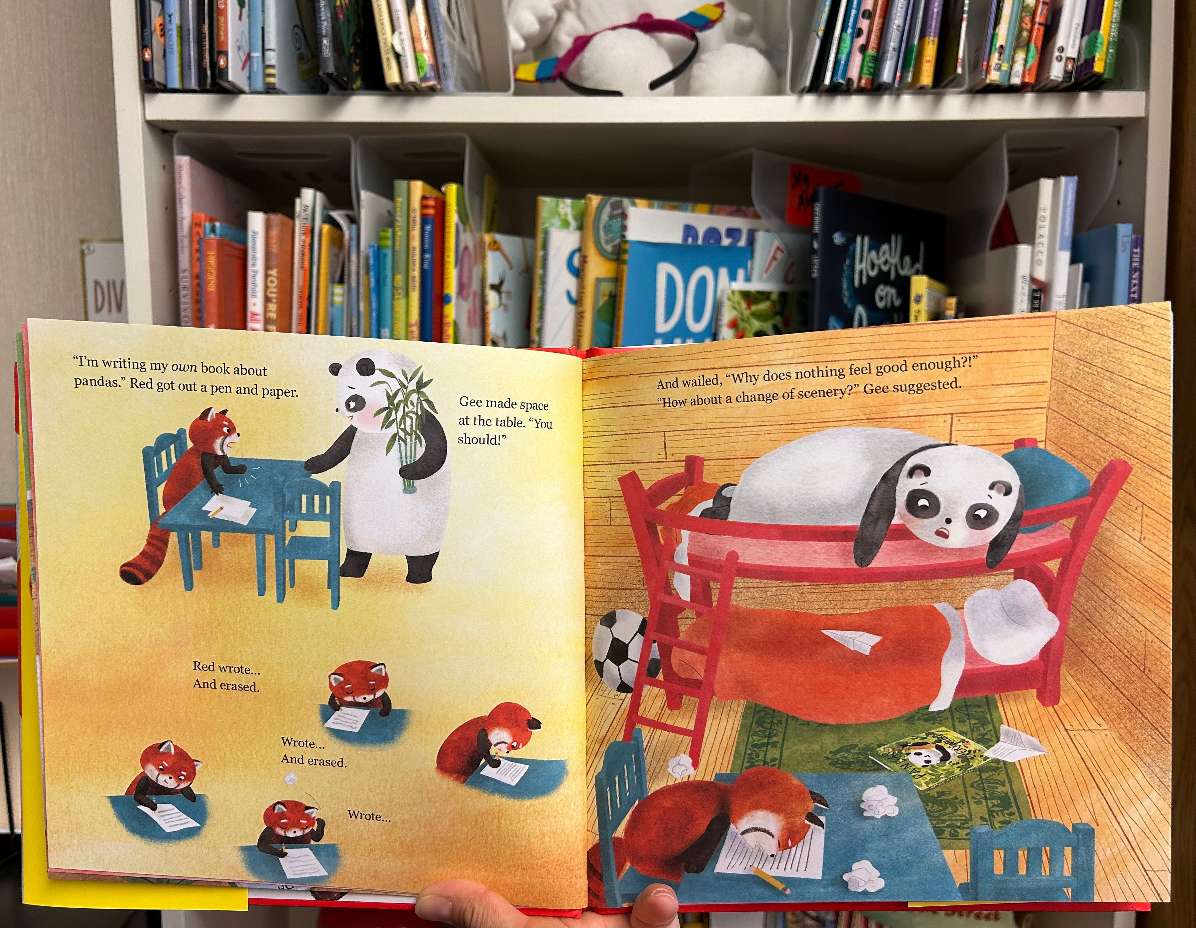 One of my very favorite recently published books is HOW THIS BOOK GOT RED. First of all, cuteness overload from Melissa’s depictions of all the pandas in the story and the different settings like the tree house and city scenes make it hard not to fall in love with the characters. Gee and Red share an empathetic, caring, and supportive friendship in the way they share fun moments together, understand when one feels down, and encourage when trying something challenging. But the brilliance of this sweet friendship story comes when the author Margaret cleverly crafts a storyline that reflects the real-life issue of representation—or not enough representation of traditionally marginalized people—in books. By framing the storyline around Red’s shock that red pandas are not included in all the books about pandas and her determination to write books that include red pandas, readers learn how important it is to see everyone in books and share your own stories. I love how the red panda community rallies around Red to give her the motivation to complete her book so that red pandas can more readily be seen in their society. Melissa even included red panda facts on the end pages so we can learn about their behavior that differs from giant pandas, and it was drawn in Red’s signature style!