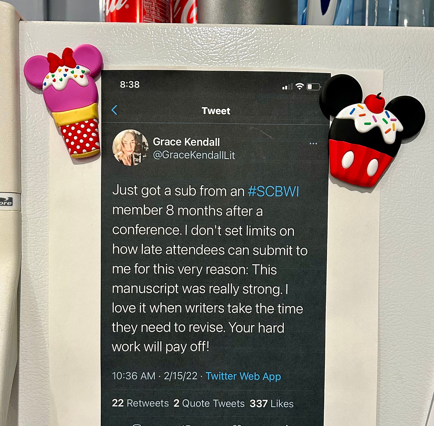 In February 2022 I started querying agents in earnest, in batches so I always had about 10 queries out at a time. I sent a certain story to 24 people that year, and I received several champagne rejections, which felt so promising. I even printed out a tweet that an editor wrote about my story and stuck it on our fridge for motivation.
